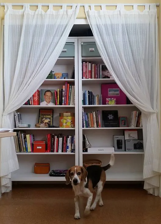 Bookcase in my office, and Buddy the Beagle
